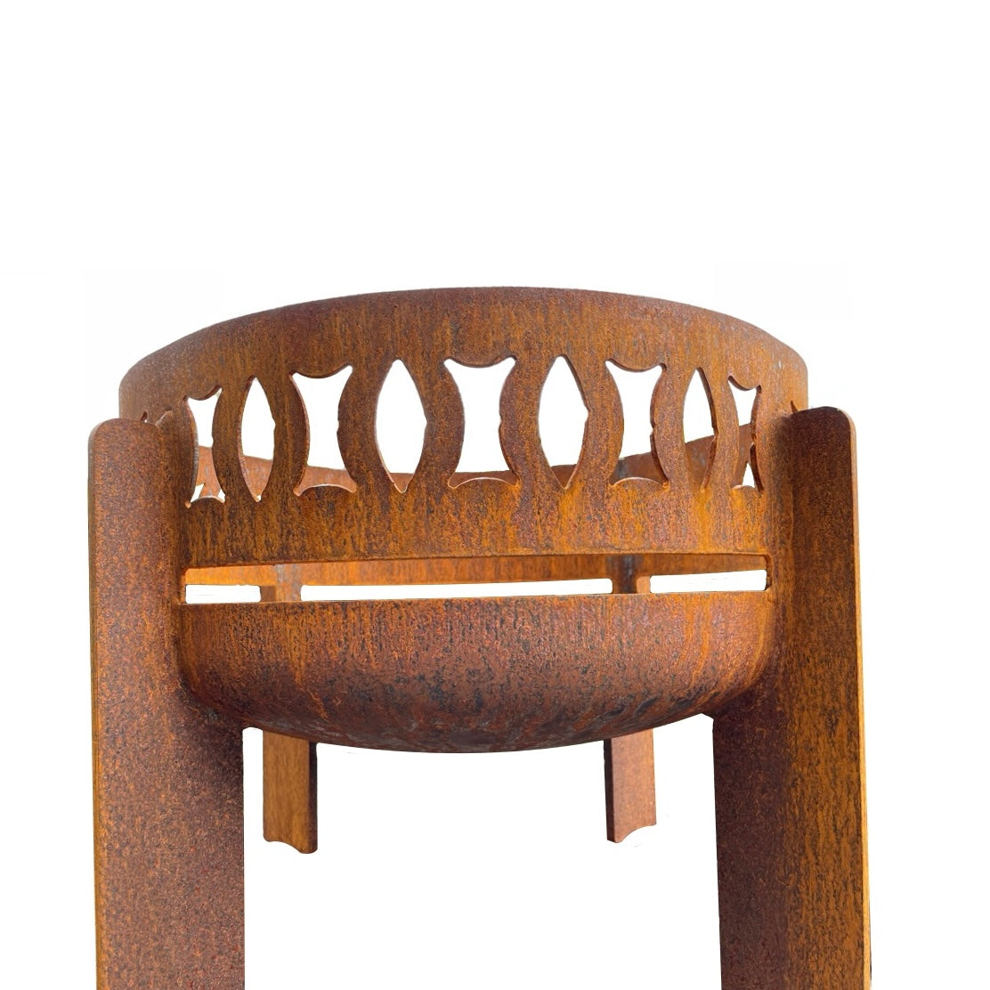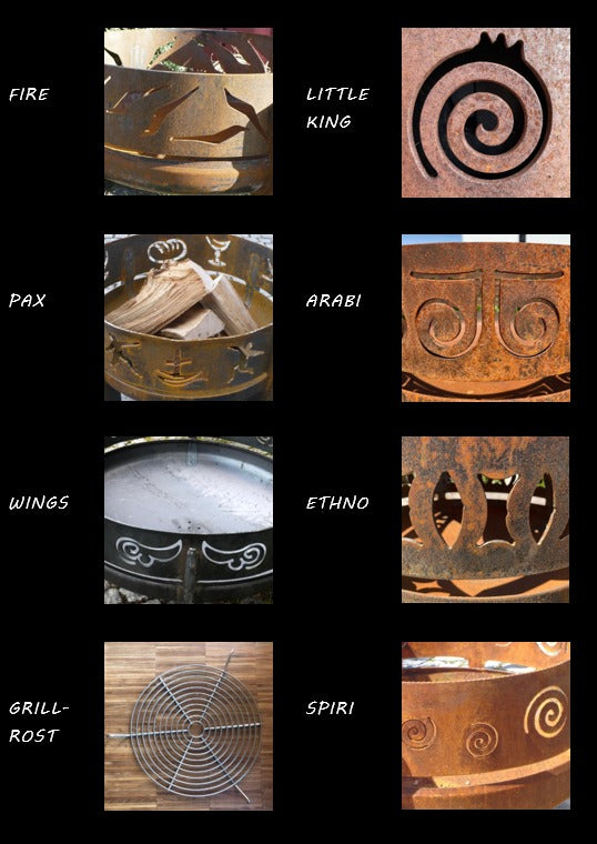 Das Design der Feuerschale ist einzigartig und zeitlos. Die klaren Ornamente und das schlichte Design verleihen der Schale ein modernes und einzigartiges Aussehen, besonders bei hellem Feuer spiegelt der Schein die Ethno Elemente wider. Der Ring mit den Ornamenten dient als praktischer Funkenschutz und ermöglicht einen optimalen Abstand zur Glut durch den auf der Website erhältlichen Grillrost.